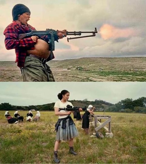 她是不育孩子的母亲,在孕期还能癫狂喝酒说笑,扛着重机枪就是一顿扫射。这种反叛且暴力的母性类型对于荧幕来说是难得的,PTA看到了被社会压迫、被问题困扰的边缘人群,并利用男性在家,女性在外的强反差突破对自由的一种全新表达。
